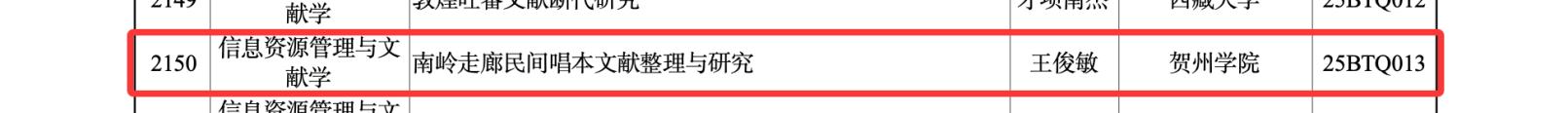 近日,全国哲学社会科学工作办公室公布了2025年国家社会科学基金年度项目评审结果,我院王俊敏博士申报的《南岭走廊民间唱本文献整理与研究》成功获批一般项目。