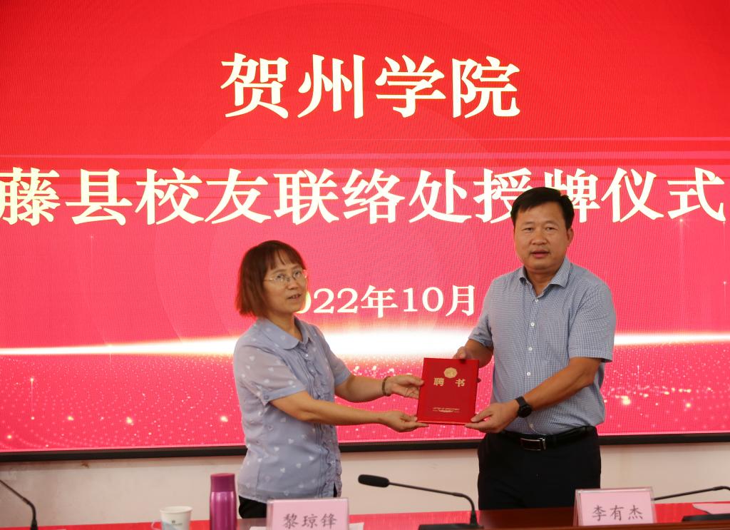 授牌仪式上,马伟勇代表筹备工作组介绍了藤县校友联络处的筹备情况,与会人员通过了藤县校友联络处组织机构候选人名单。李有杰当选藤县校友联络处主任,他表示将秉持“情系贺院共赢未来”的初心,发扬贺州学院校训精神,组织和带领藤县校友持续为母校的发展作贡献。卓子雄代表筹备工作组介绍了梧州校友联络处的筹备情况,与会人员通过了梧州校友联络处组织机构候选人名单,并一致推选他出任梧州校友联络处主任。卓子雄表示,梧州市作为距离母校最近的城市之一,历年来汇聚了众多优秀校友,大家始终关注和牵挂着母校的发展,愿携手并肩为母校插上腾飞之翼,共同助力母校高质量发展。